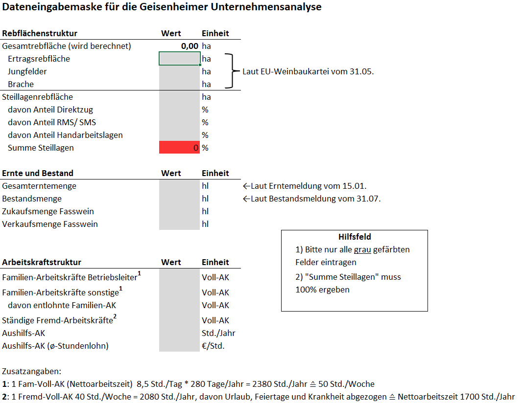 Zusätzlich bitten wir Sie ein vorgegebenes Eingabemuster (siehe rechts) mit den Eckdaten Ihres Betriebes auszufüllen.